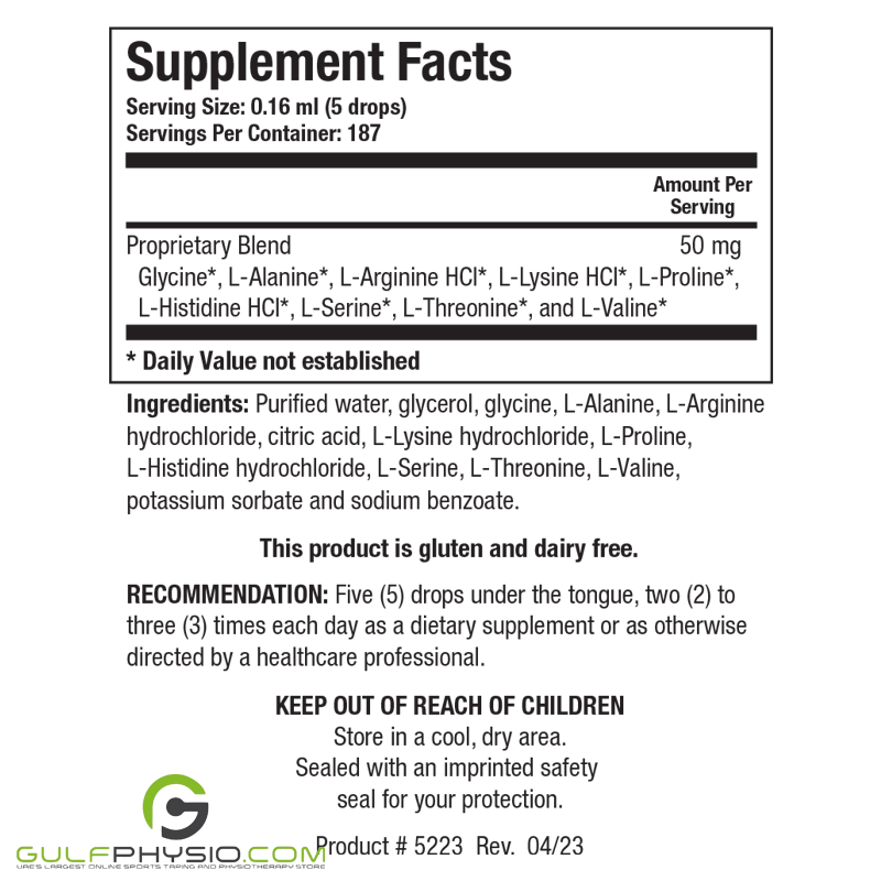 Glycine, L-Alanine, L-Arginine HCl, L-Lysine HCl, L-Proline, L-Histidine HCl, L-Serine, L-Threonine, L-Valine. Purified water, glycerol, glycine, L-Alanine, L-Arginine hydrochloride, citric acid, L-Lysine hydrochloride, L-Proline, L-Histidine hydrochloride, L-Serine, L-Threonine, L-Valine, potassium sorbate and sodium benzoate.