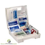This 89-piece, 25-person bulk first aid kit meets OSHA and ANSI standards. It is designed for use in small offices, vehicles and work sites. The partitioned case is wall-mountable, yet has a handle for easy carrying which makes it perfect for both a worksite and an office. It is jam-packed with first aid essentials ranging from bandages to BZK wipes to scissors, gauze, and more.