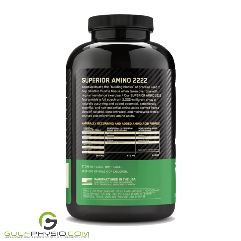 Superior Amino 2222 Tabs provide 2.2 grams of 18 different amino acids per 2-tablet serving to add to the amount you consume through protein shakes, bars and whole foods. Used in conjunction with a well-planned diet that includes complete proteins, these tablets contain an array of naturally occurring and added essential, conditionally essential, and non-essential amino acids derived from a blend of isolated, concentrated, and hydrolyzed protein sources plus micronized amino acids.